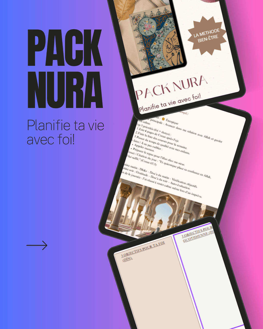 C’est ainsi qu’est né le Pack NURA : un planner spirituel et organisationnel conçu pour les femmes musulmanes qui veulent se sentir sereines, régulières dans leurs adorations et maîtresses de leur temps.